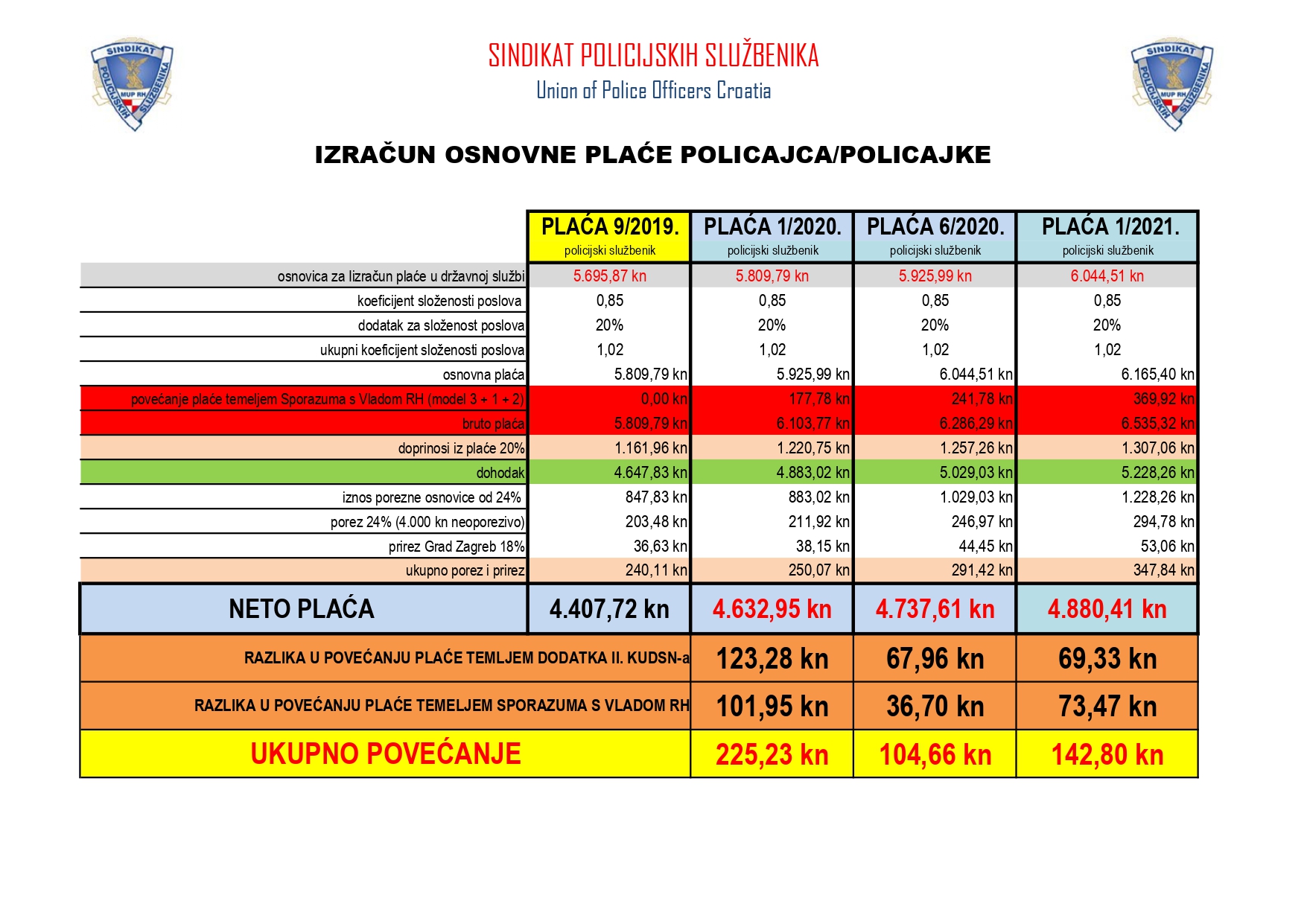 Dostavili smo Vam izračun povećanja osnovne plaće za 4 kategorije policijskih službenika temeljem Dodatka II. Kolektivnog ugovora za državne službenike i namještenike. Po njoj osnovna plaća najniže plaćenog policijskog službenika, iznosi sramotnih 4.407,72 kuna dok su osnovne plaće rukovodećih policijskih službenika (načelnik policijske postaje, načelnik policijske uprave, zamjenik glavnog ravnatelja policije) dvostruko, trostruko, pa čak i četverostruko veće. Takav omjer plaća niti je normalan, niti pošten, a podršku takvom omjeru plaća dali su upravo reprezentativni sindikati koje se itekako pitalo kada se donosila Uredba o plaćama policijskih službenika, kao i sve njene daljnje izmjene i dopune i znamo da takav omjer odgovora samo onima koji žele poslušan i podoban sustav u kojem šefovi, kojih u MUP-u ima previše, nakon karijere u MUP-u završavaju u raznoraznim državnim agencijama, nogometnim savezima i sl. jer su svojim „zaslugama“ tijekom službe i ustupcima politici i interesnim skupinama zaslužili da ih se nagradi s još jednom vrlo dobro plaćenom pozicijom u društvu.