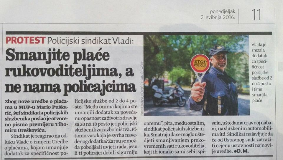 Dana 18. travnja 2016. godine uputili smo Vam dopis kojim smo podržali povećanje plaća policijskim službenicima koji rade na početnim radnim mjestima u policijskim postajama i čija je trenutno osnovna plaća oko 3650 kuna, ali smo se protivili načinom na koji je MUP RH to planirao provesti, a sada već i proveo putem Uredbe o izmjenama Uredbe o plaćama policijskih službenika koju je Vaša Vlada RH donijela na svojoj 17. sjednici te je danas objavljena u „Narodnim novinama“ 40/16 i stupa na snagu 1. svibnja 2016. godine.