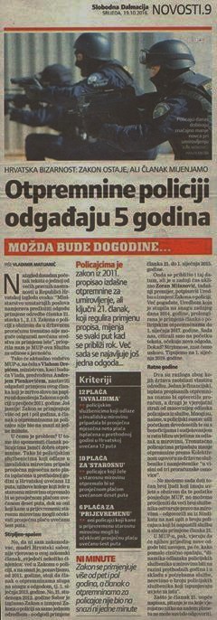 Obzirom da se sukladno odredbi članka 21. Zakona o policiji s 1. 1. 2017. godine treba započeti novi način isplate otpremnina policijskim službenicima, a da je danas 19. 10. 2016. godine u tiskanom izdanju Slobodne Dalmacije izašao članak pod naslovom „Otpremnine policiji odgađaju 5 godina“ ovom prilikom tražimo od Vas odgovor da li je to točno i da li je to službeni stav Vas i nove buduće Vlade RH?