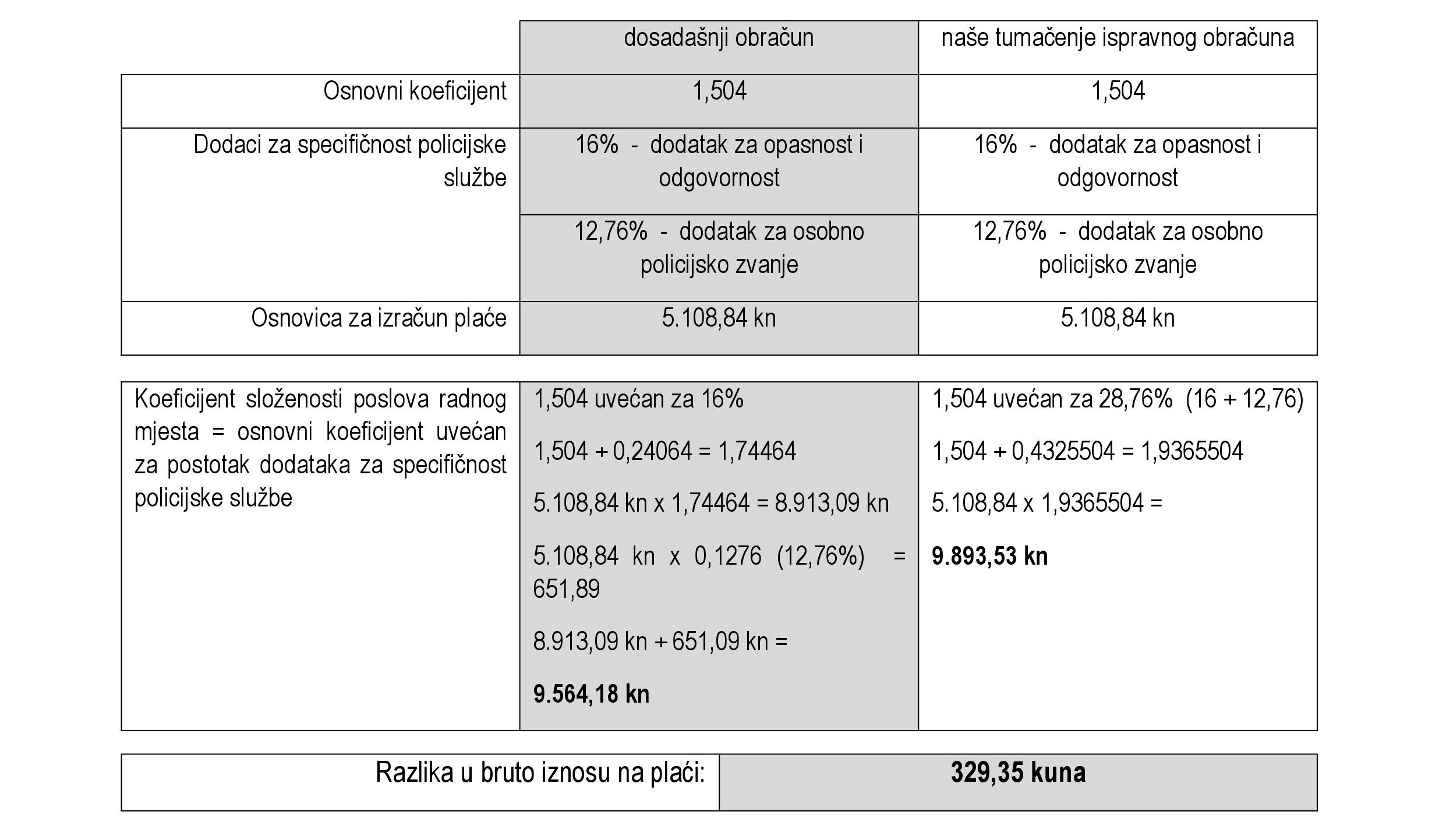 U dosadašnjem obračunu plaća Ministarstvo unutarnjih poslova ne uvećava osnovni koeficijent s dodatkom za osobno policijsko zvanje već taj dodatak za osobno policijsko zvanje množi s osnovicom za izračun plaće svim državnim službenicima i namještenicima (5.108,84 kn) i pridodaje ga osnovnom koeficijentu što je pogrešna primjena prava i u praksi čini materijalnu štetu policijskim službenicima (što je veće policijsko zvanje i koeficijent radnog mjesta veći je iznos štete).